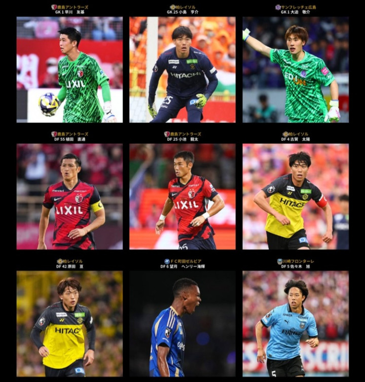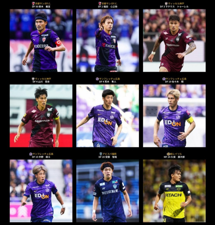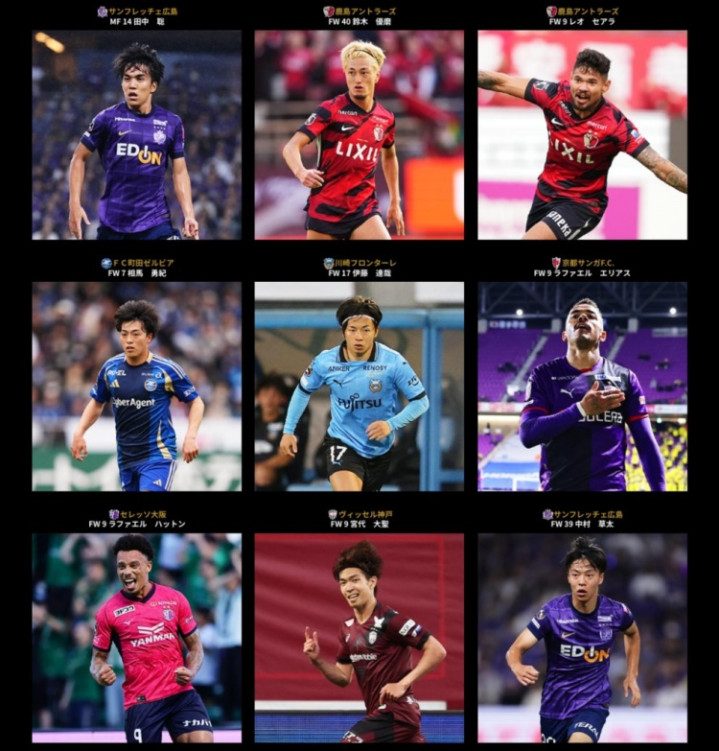 前锋:铃木优磨(鹿岛鹿角)、莱奥·塞阿拉(鹿岛鹿角)、相马勇纪(町田泽维亚)、伊藤达哉(川崎前锋)、埃利亚斯(京都不死鸟)、拉斐尔(大阪樱花)、宫代大圣(神户胜利船)、中村草太(广岛三箭)